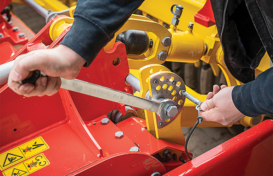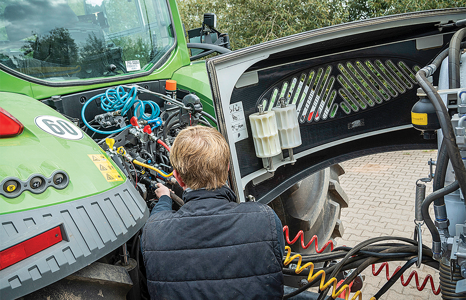 Επιστρέφοντας στο µοντέλο της δοκιµής, το µηχάνηµα µας είχε υδραυλικό σύστηµα «Smartline» Αυτό σηµαίνει ότι οι ξεχωριστές λειτουργίες ελέγχονται από τους κοτσαδόρους αντί για το τερµατικό. Για πολλούς, αυτή η προσέγγιση θα είναι παραπάνω από επαρκής, αφού τα περισσότερα τρακτέρ θα διαθέτουν τους απαραίτητους τρεις κοτσαδόρους δύο δράσεων και έναν µονής δράσης, καθώς και µια γραµµή επιστροφής ελεύθερης ροής. Έγχρωµες λαβές στους υδραυλικούς σωλήνες καθιστούν εύκολο τον εντοπισµό τους, ο οποίος είναι αρκετά εύκολος όταν αντιληφθείς τα αναγνωριστικά ντεκάλ στο εσωτερικό της πόρτας του τµήµατος αποθήκευσης.