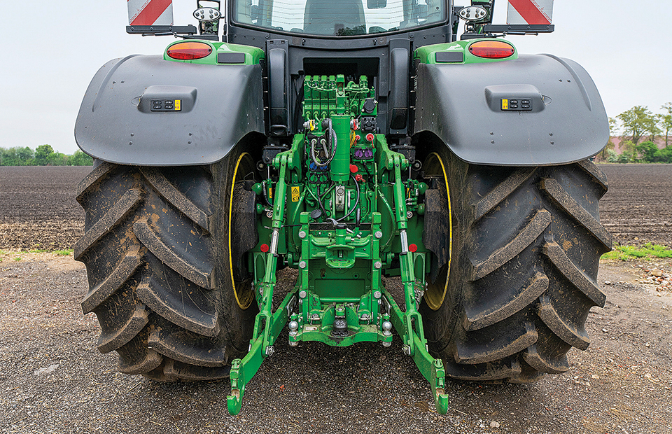 Όσον αφορά τους υδραυλικούς συνδέσµους στο πίσω µέρος, το 6R250 έχει πέντε κοτσαδόρους και συνδέσµους Power-Beyond (έξι χωρίς Power-Beyond). Οι σύνδεσµοι έχουν ακόµα λεβιέ για µείωση της πίεσης, καθώς και δυνατότητα προσαρµογής χρόνου και ροής. Η εµβολοφόρα αντλία παρέχει µέχρι και 195 λίτρα ανά λεπτό. Αυτό που παρατάσσει η John Deere για το sport πακέτο των 6R250 είναι ότι παρέχει οµαλή, σταθερή και βελτιωµένη ακρίβεια οδήγησης – χάρη στο νέο σύνδεσµο οδήγησης. Αυτό είναι κάτι που µπορούµε να επιβεβαιώσουµε. Σε σχέση µε το µικρότερο 6R175, ο µπροστινός άξονας µε τους εξωτερικούς του κυλίνδρους είναι ακόµα πολύ στιβαρός. Το ίδιο ισχύει και για το φρένο: Με ένα απαλό πάτηµα του ποδιού, µπορούν να ακινητοποιηθούν το τρακτέρ 9,6 τόνων µε επιβράδυνση 5,45 µέτρων/δ².