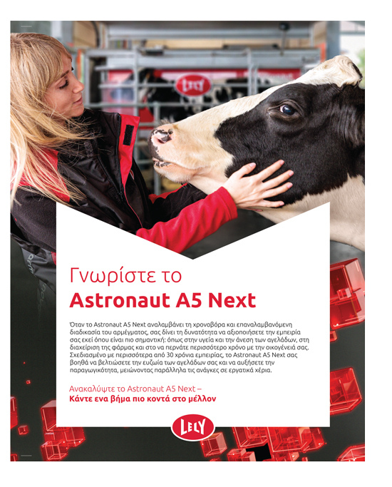 Σας δίνουµε τη δυνατότητα να έχετε µεγαλύτερο έλεγχο, να διασφαλίζετε βιώσιµες πρακτικές, να ικανοποιείτε τις προσδοκίες των καταναλωτών και να προετοιµάσετε την επιχείρησή σας για την επόµενη γενιά. Βασισµένη στην παράδοση αυτοµατισµού µας για περισσότερα από 30 χρόνια, η Lely συνεχίζει να διευρύνει τα όρια του εφικτού στη γαλακτοπαραγωγή. Το προηγµένο λογισµικό διαχείρισης φάρµας παρέχει εκτεταµένη υποστήριξη λήψης αποφάσεων που σας επιτρέπει να διαχειρίζεστε το κόστος σας και να ανταποκρίνεστε στις απαιτήσεις διαφάνειας – όλα αυτά συµβάλλουν στο ανταγωνιστικό σας πλεονέκτηµα. Με το νέο Astronaut A5 Next σκεφτόµαστε πέρα από το αύριο. Εσείς και η φάρµα σας θα είστε περισσότερο από ποτέ προετοιµασµένοι για τις µελλοντικές προκλήσεις και ευκαιρίες.