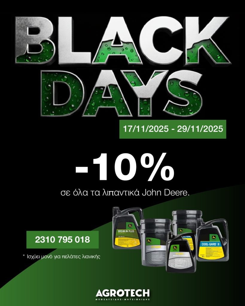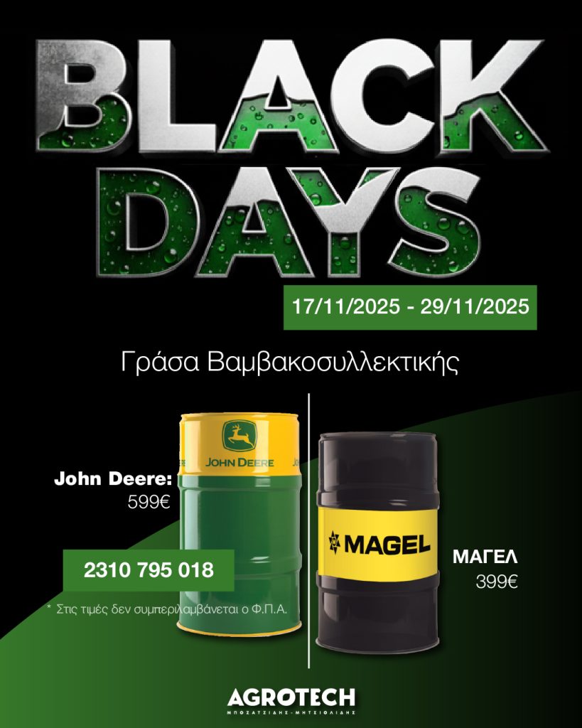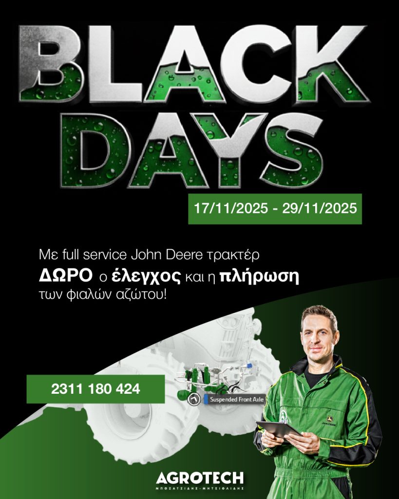Σε σημαντικές προσφορές που καλύπτουν όλο το φάσμα της γεωργικής τεχνολογίας προχωράει η Agrotech ως και τις 29 Νοεμβρίου. Εκπτώσεις και ειδικές τιμές σε drones, λιπαντικά, service και ανταλλακτικά John Deere δημιουργούν μια περίοδο πραγματικά μοναδικών ευκαιριών για κάθε επαγγελματία του κλάδου. Προσφορές που συνδυάζουν απόδοση, ποιότητα και άμεση διαθεσιμότητα, καθιστούν τα Black Days της Agrotech σημείο αναφοράς για τη φετινή χρονιά.
