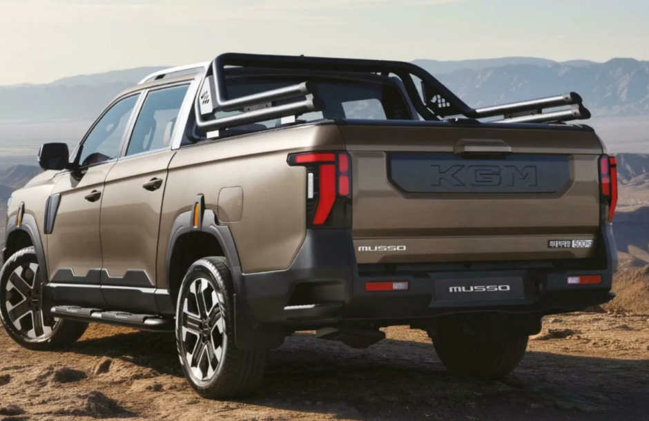 Στο πίσω μέρος, κάθετα φώτα LED πλαισιώνουν μια σμιλεμένη πίσω πόρτα που φέρει εμφανώς το λογότυπο της KGM. Μια γενναιόδωρη μαύρη πλαστική επένδυση περιβάλλει το κάτω τμήμα, το οποίο περιλαμβάνει έναν επανασχεδιασμένο προφυλακτήρα με ενσωματωμένα σκαλοπάτια. Μια μακριά, σωληνοειδής σπορ μπάρα βρίσκεται στην κορυφή του χώρου φόρτωσης, προσθέτοντας μια πιο χρηστική πινελιά.